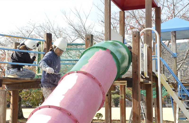 14日、府中公園で(一社)日本塗装工業会広島県支部が遊具や東屋の塗り直しボランティアを行い、錆や塗装の剥げていた部分が見る間に綺麗になり生まれ変わった。
