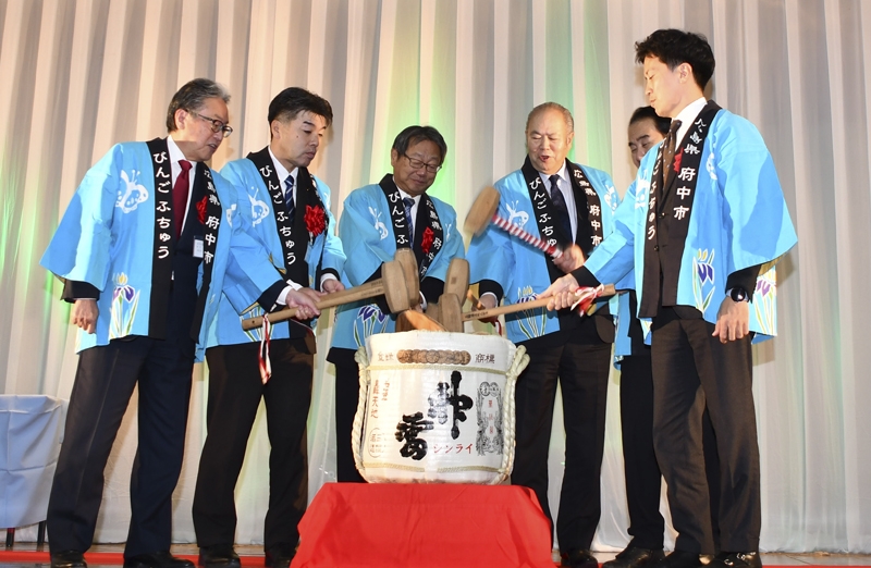 11日、最強寒波の影響で朝から雪が吹き荒れた芦田川河川敷で府中市消防出初式が行われ、消防団員307人、府中消防署員40人が参加。