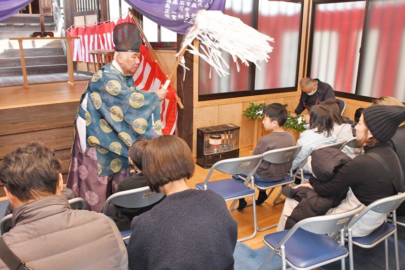 広谷町の稲月神社(小田芳夫宮司)で8日、春の例大祭に合わせ、4月から旭小学校へ通う同町内の新1年生11人を対象に、勧学祭・学業成就祈願祭が行われた。