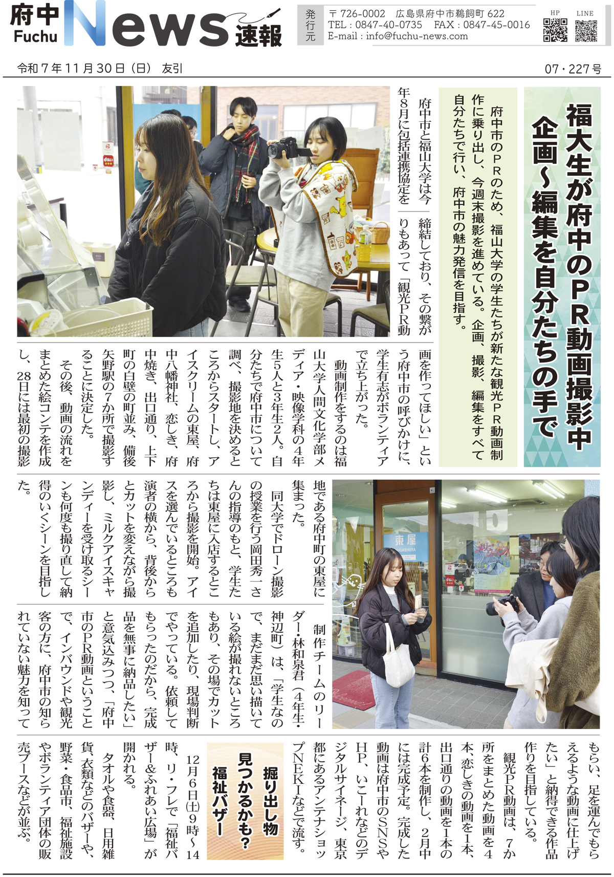 府中市のPRのため、福山大学の学生たちが新たな観光PR動画制作に乗り出し、今週末撮影を進めている。企画、撮影、編集をすべて自分たちで行い、府中市の魅力発信を目指す。