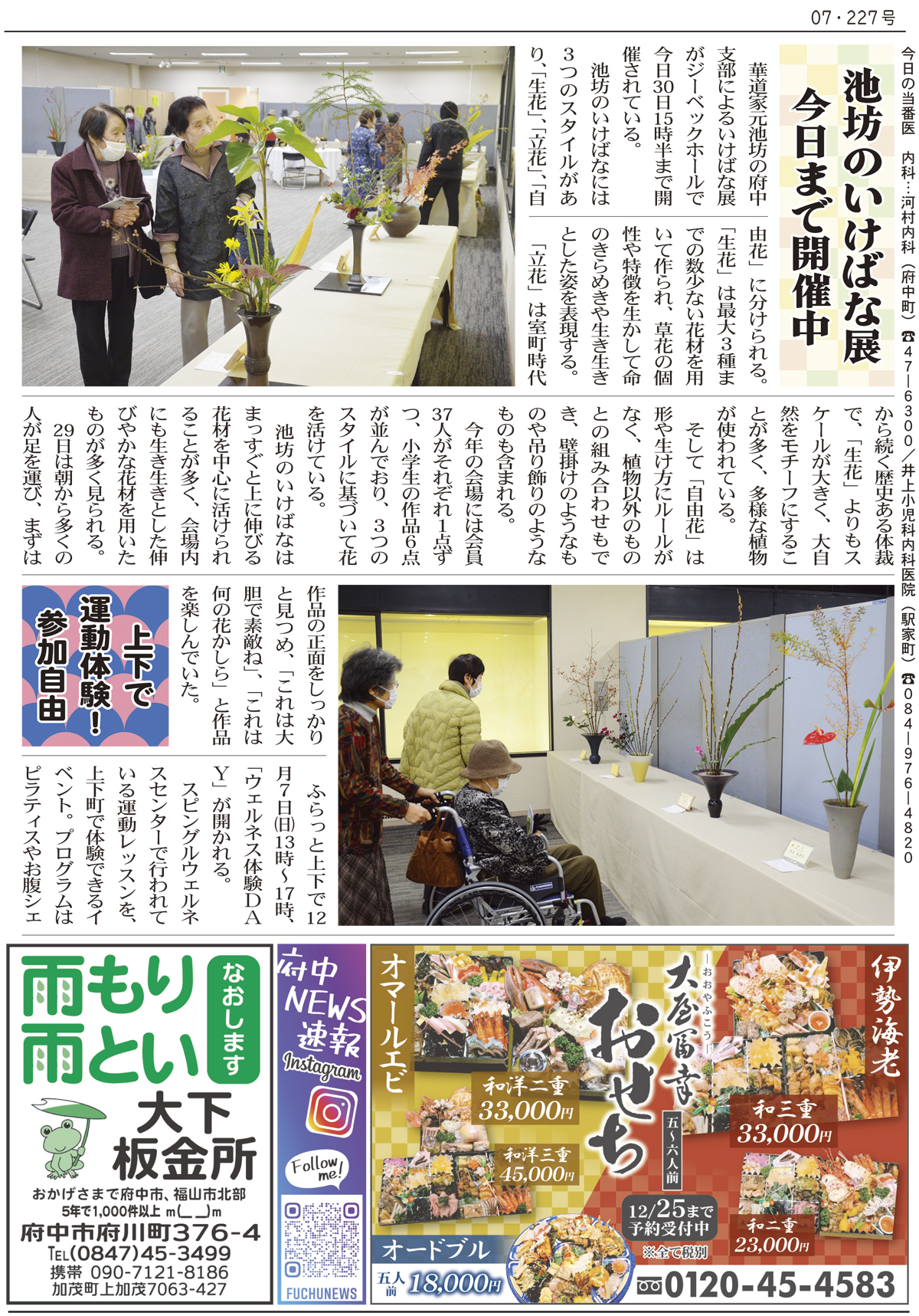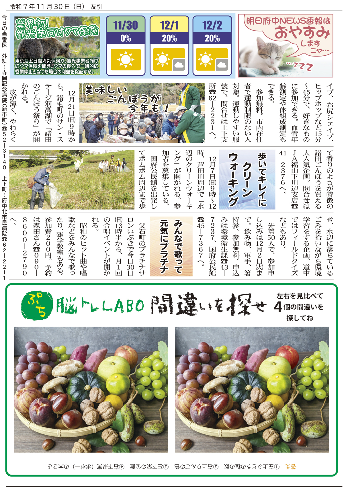 先着50人で、参加申し込みは12月2日(火)まで。飲み物、軍手、箸持参。参加無料。申込みは環境衛生課【電話】43―7237、国府公民館【電話】45―7367へ。