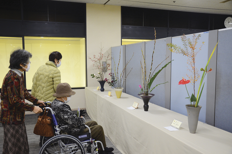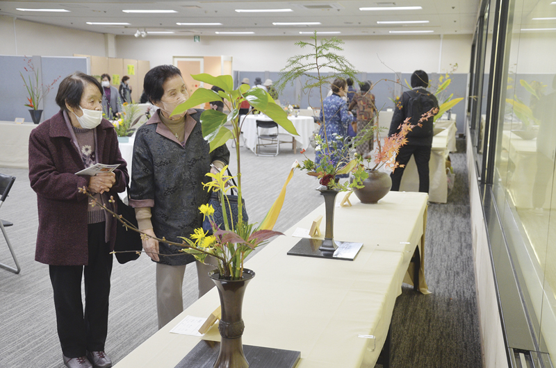 今年の会場には会員37人がそれぞれ1点ずつ、小学生の作品6点が並んでおり、3つのスタイルに基づいて花を活けている。