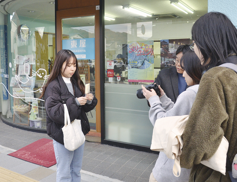 動画制作をするのは福山大学人間文化学部メディア・映像学科の4年生5人と3年生2人。自分たちで府中市について調べ、撮影地を決めるところからスタートし、アイスクリームの東屋、府中八幡神社、恋しき、府中焼き、出口通り、上下町の白壁の町並み、備後矢野駅の7か所で撮影することに決定した。