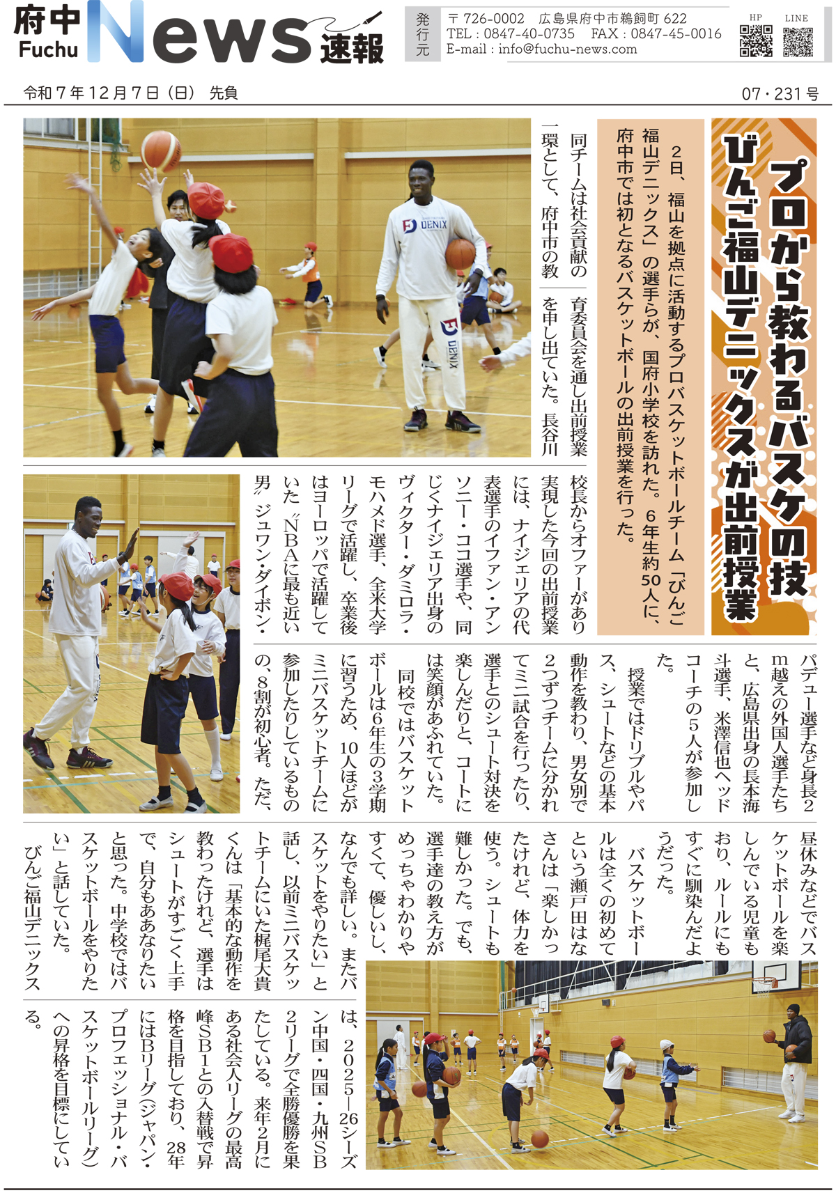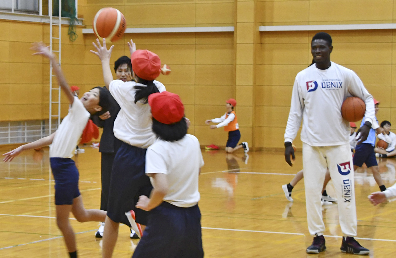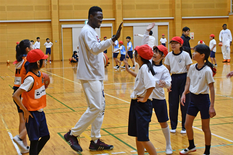 同チームは社会貢献の一環として、府中市の教育委員会を通し出前授業を申し出ていた。長谷川校長からオファーがあり実現した今回の出前授業には、ナイジェリアの代表選手のイファン・アンソニー・ココ選手や、同じくナイジェリア出身のヴィクター・ダミロラ・モハメド選手、全米大学リーグで活躍し、卒業後はヨーロッパで活躍していた〝NBAに最も近い男”ジュワン・ダイボン・パデュー選手など身長2m越えの外国人選手たちと、広島県出身の長本海斗選手、米澤信也ヘッドコーチの5人が参加した。