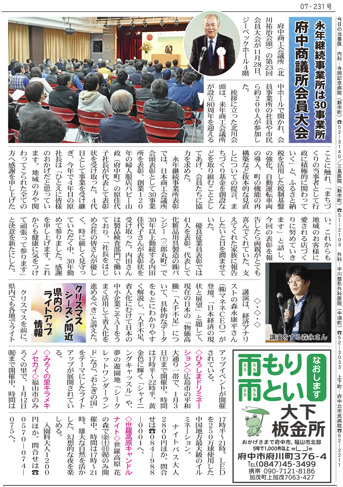 府中商工会議所(北川祐治会頭)の第23回会員大会が11月28日、ジーベックホール4階中ホールで開かれ、会員事業所の社員や市民ら約200人が参加した。