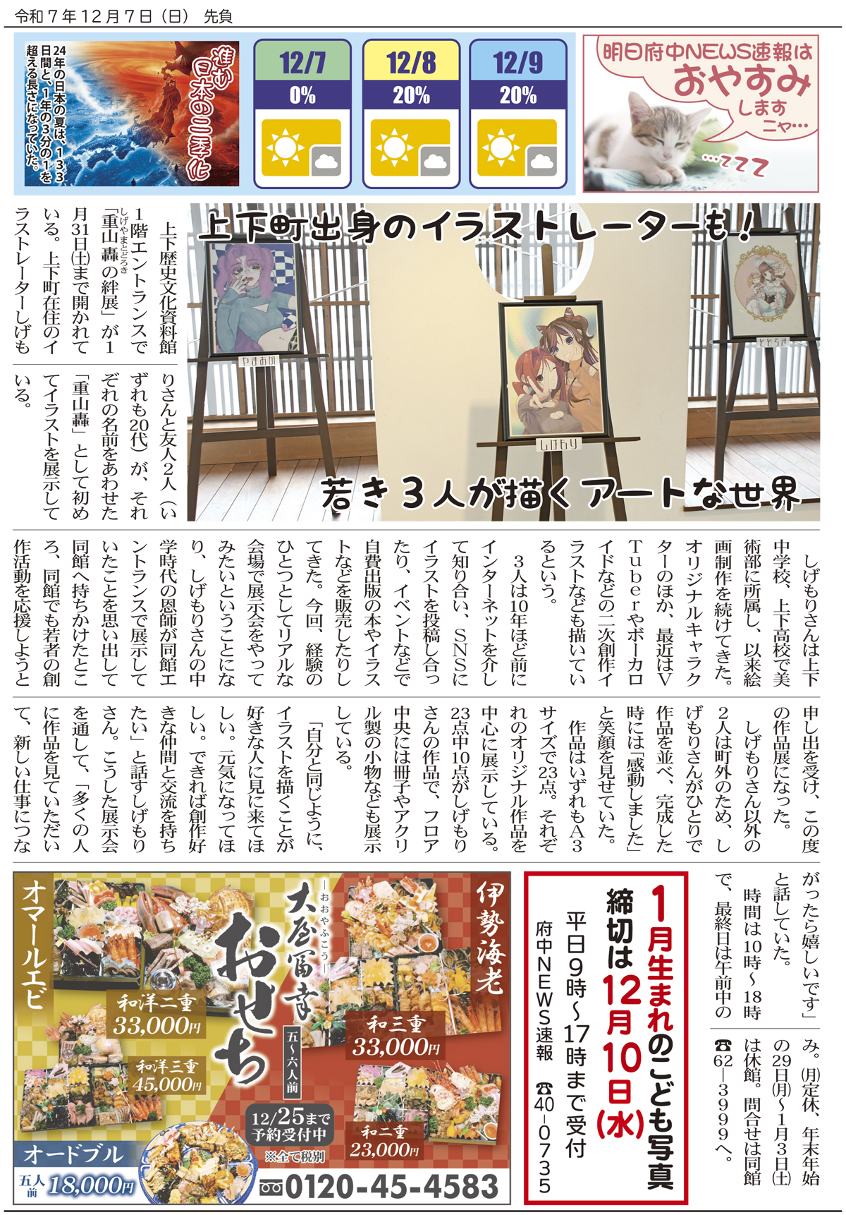 上下歴史文化資料館1階エントランスで「重山轟の絆展」が1月31日(土)まで開かれている。上下町在住のイラストレーターしげもりさんと友人2人(いずれも20代)が、それぞれの名前をあわせた「重山轟」として初めてイラストを展示している。