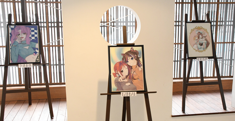 3人は10年ほど前にインターネットを介して知り合い、SNSにイラストを投稿し合ったり、イベントなどで自費出版の本やイラストなどを販売したりしてきた。今回、経験のひとつとしてリアルな会場で展示会をやってみたいということになり、しげもりさんの中学時代の恩師が同館エントランスで展示していたことを思い出して同館へ持ちかけたところ、同館でも若者の創作活動を応援しようと申し出を受け、この度の作品展になった。