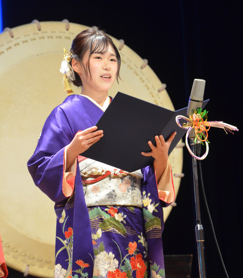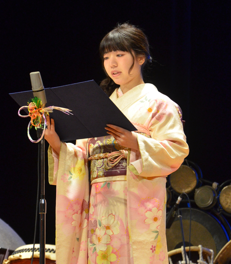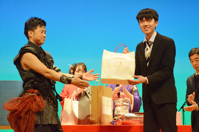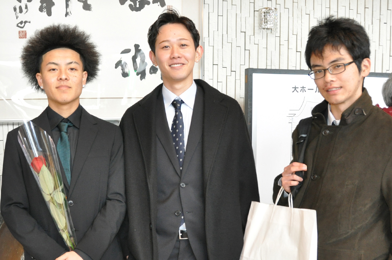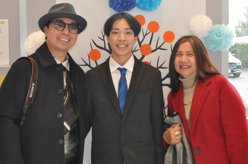 上下町在住のフィリピン人の両親と出席したギロン・リュウ君(中央)は、「考え方を広げて、色んな視点で幅広く行動していきたい」と思いを。