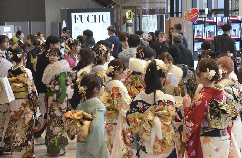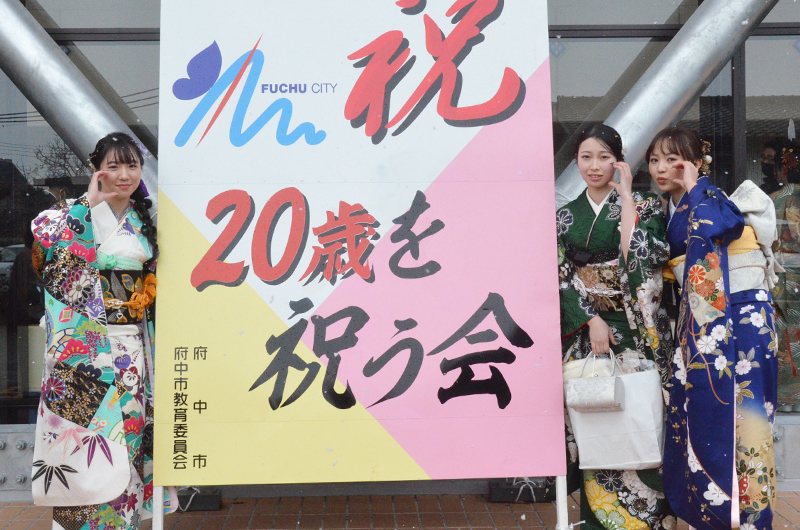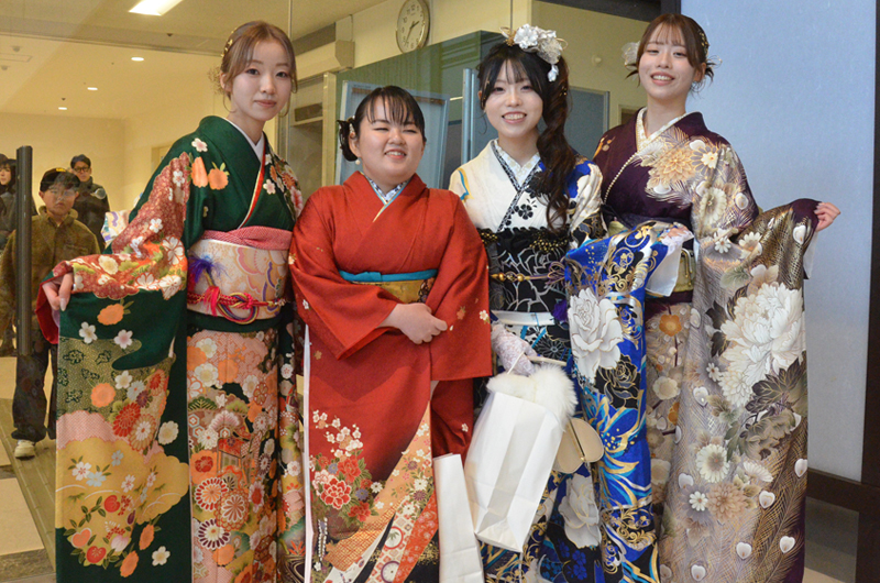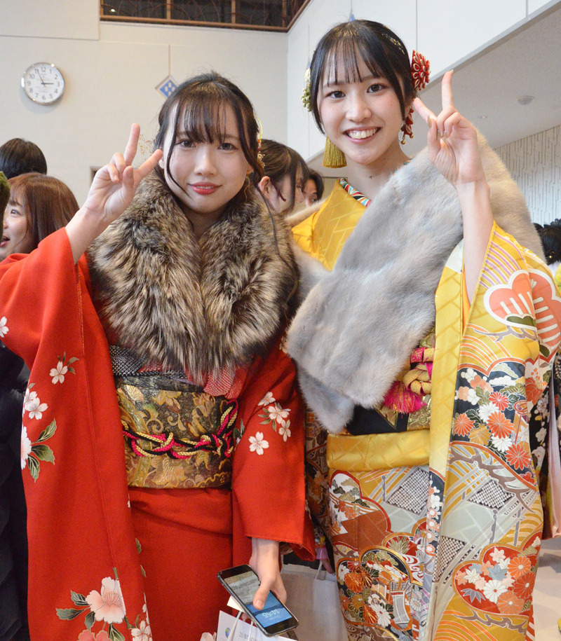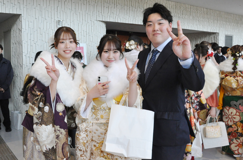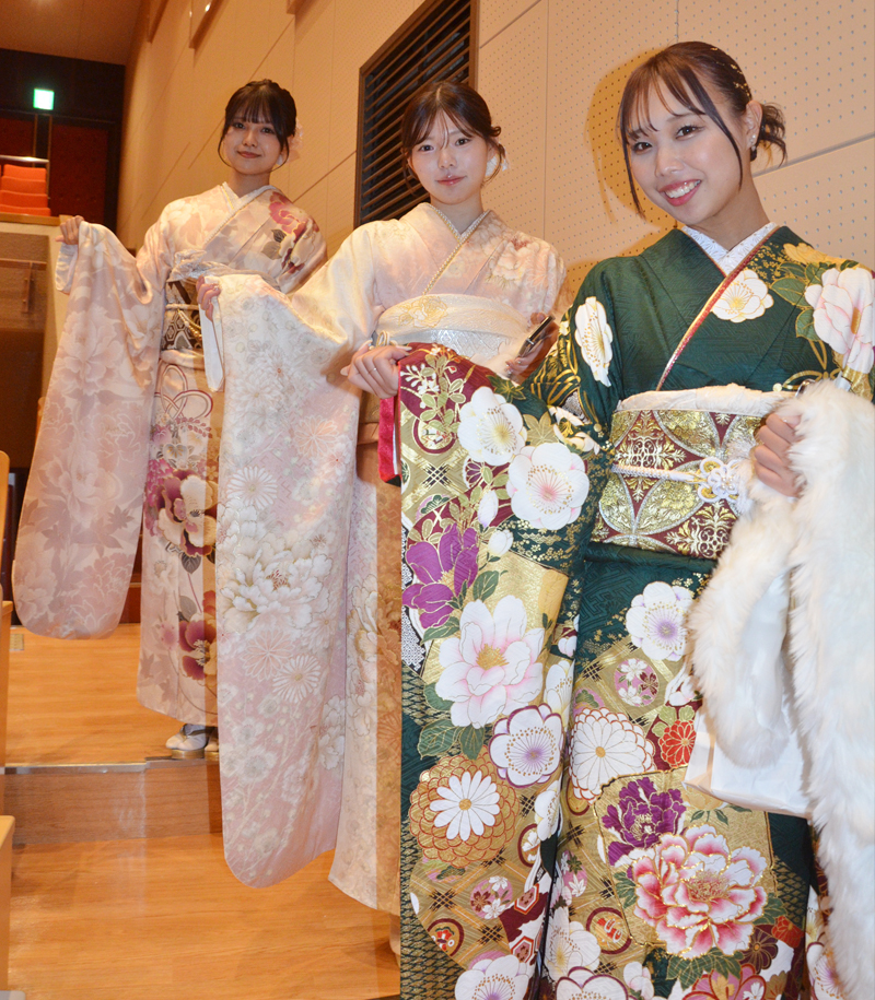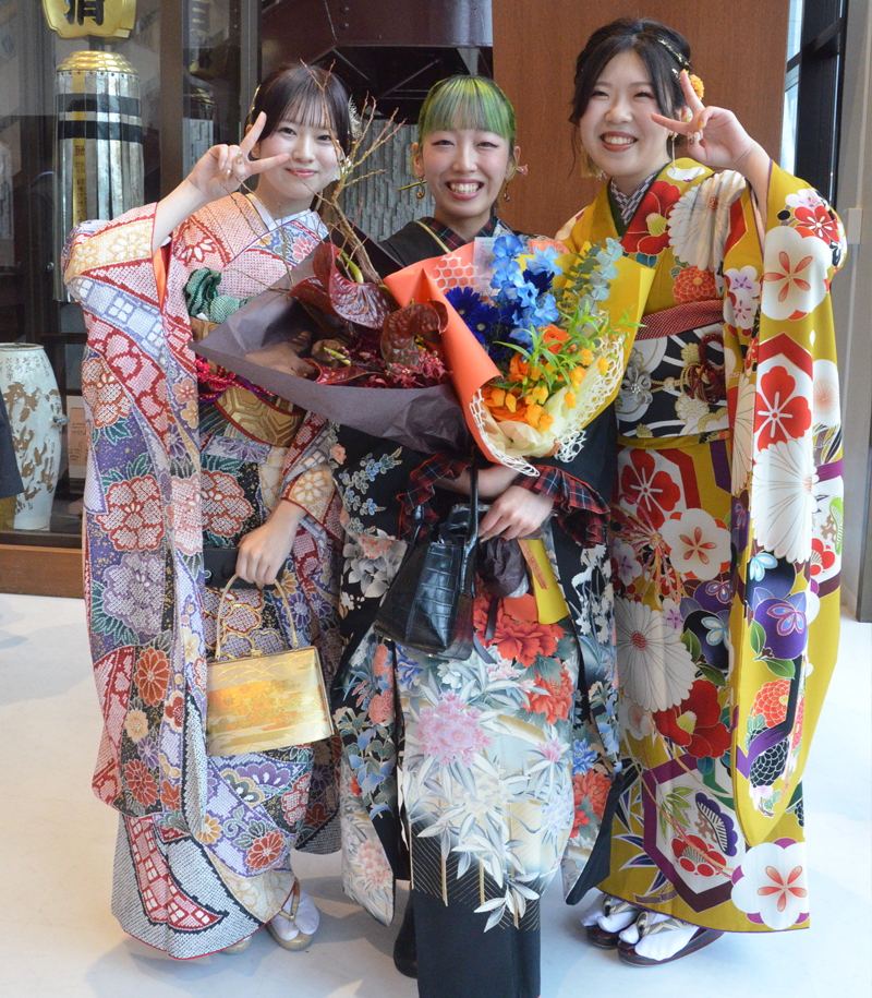 盈進高校の同級生3人組。緑の振袖姿の小川まなさんは作業療法士の勉強中。「健康に育ててくれた親に日々感謝しながら生きていきたい」と泣ける一言を。
