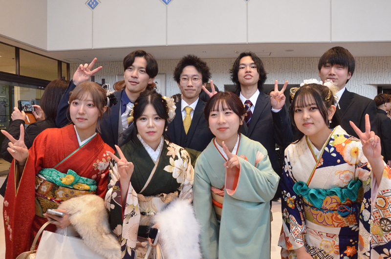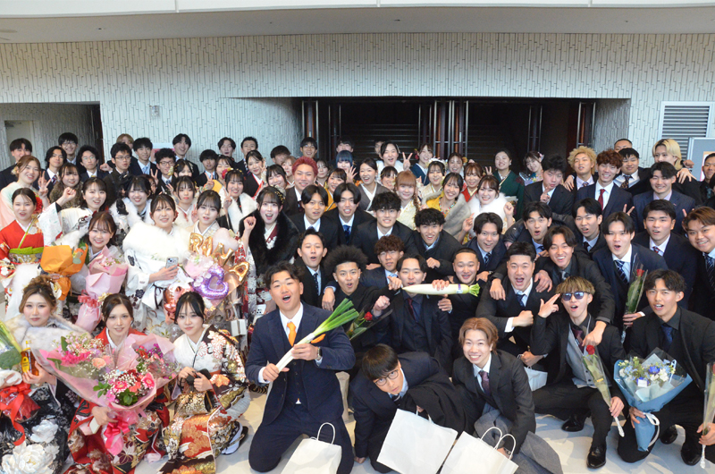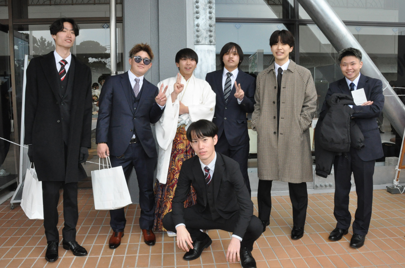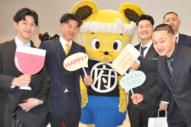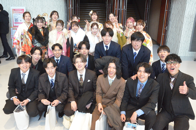 府中学園の同級生でパシャリ。右から2番目の熊谷太貴君は「コロナ禍で目の下の顔がわからないような中学生時代だったから、今日みんなの顔を見てすごく新鮮。責任あるちゃんとした大人になりたい」。