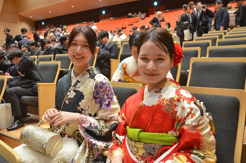 広大附属福山で中学・高校を共にした阿世比丸和加さん(右)と小西清歌さん。小西さんは「人が人生を楽しめるお手伝いができる人に」。阿世比丸さんは「1人暮らしで親のありがたみに気付いた。感謝している」とそれぞれの思いを語った。