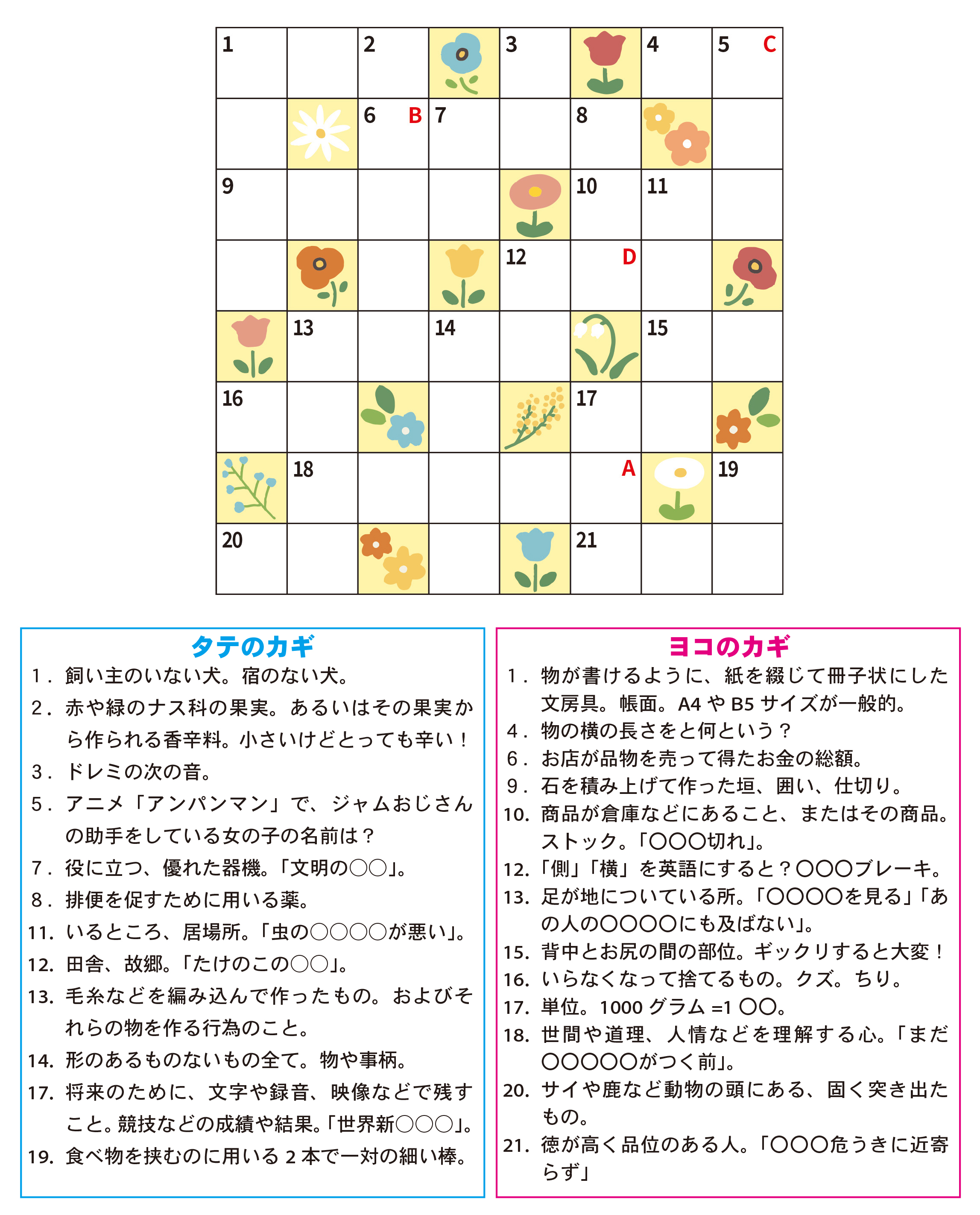 今月のクイズはクロスワード。タテヨコのカギを解いてマスを埋めてください。最後にA~Dを並べて現れる花の名前が答えです。