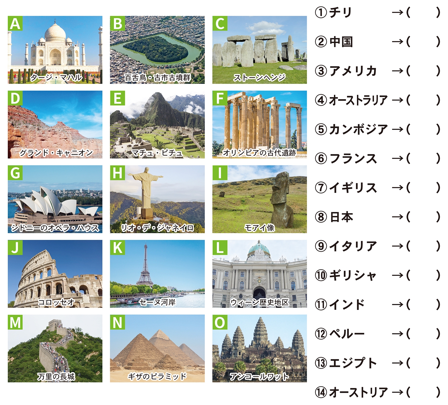 どの写真がどの国の世界遺産か①~⑭に適切なアルファベットを入れてください。